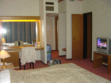 ホテルに向かう直前にものすごい雨が降ってきて、バスを降りてホテルのロビーに入るまでに少し濡れてしまいました。添乗員さんが皆さんのチェックインの手続きをしてくださり、ロビーでそれぞれの部屋の部屋番号とカードキーを受け取り、まずは部屋に入ることに。その前にバスの運転手さんから1ユーロでペットボトルの水を購入しようとしたのですが、イタリアに到着したての私たちにはお札しかありません。5ユーロ紙幣を出してもおつりがないというので、ホテルのフロントに両替をお願いしたところ、両替するだけのおつりがないらしい(汗)そんなことで、お水は購入できず。とりあえず部屋に入りました。荷物はポーターさんが部屋の前まで運んでくれます。お部屋は赤を基調にしたいい雰囲気。部屋をチェックしていると、洗面&お手洗い&お風呂に、ありましたありました、あのビデさんが!!!!間違って手を洗ってしまいそうです(笑)本当に習慣が違うと勝手が違います。そして便器はどこのボタンを押せば水が流れるのか全然分かりませんでした(後で無事に分かりました)。そしてイタリアのホテルにはないことが多いと言われていた「バスタブ」も、このホテルではちゃんとありました(ほっと一安心)