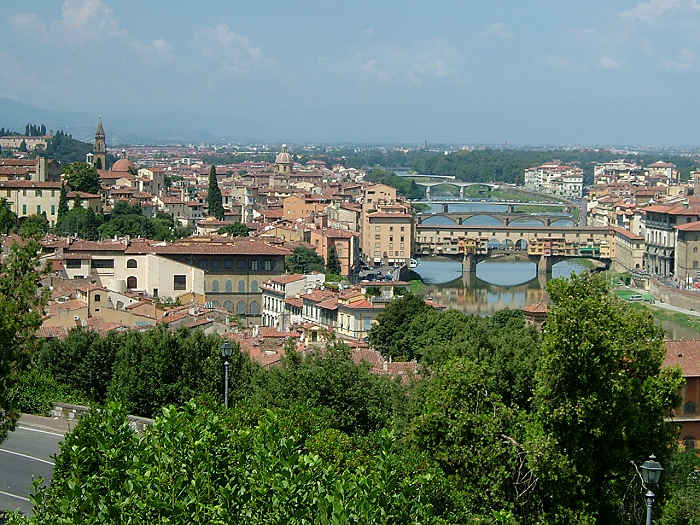 ○昼食〜フィレンツェ市内観光 フィレンツェといえば、竹野内豊&ケリー・チャン主演の映画「冷静と情熱のあいだ」ですね。車中でガイドさんから映画の説明があったのですが、竹野内豊ファンだった私はもうチェック済みです(笑)ミレニアム前の1999年の冬に福岡の映画館で見た記憶があります。そのときは竹野内くんしか見ていなくて、舞台となったフィレンツェやミラノについては無関心だった私ですが、今回ちゃんと映画を見てきました!!!素敵な映画です。バスは再びフィレンツェへ戻りました。最初はフィレンツェの街を一望できる高台の「ミケランジェロ広場」に到着。広場には中央に巨大なダヴィデ像が建ち、その周りは大きな広場になっています。ドゥオモやジョットの鐘楼、アルノ川やベッキオ橋など有名どころも一望できるここからの息を呑むような美しいフィレンツェの町並みはもう絵葉書を見るような、それはもう素晴らしい風景です。とっても感動して何度も何度もカメラのシャッターを切りました。