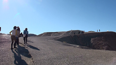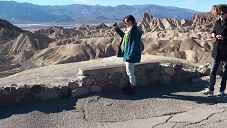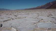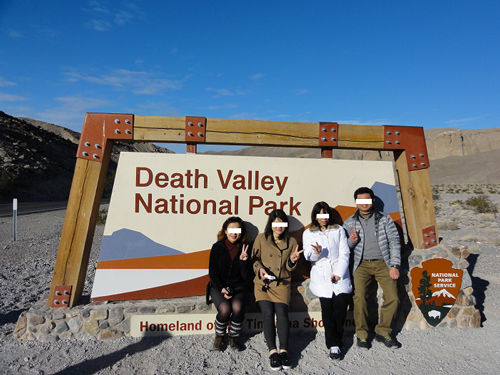 私たちは朝7時にティーアイロビーに集合。その後バスなどが駐車する車寄せに7時10分頃移動して、少々待つこと数分、デスバレーツアー催行会社のネバダ観光サービスのお迎えの車が到着したので、私たちは早速乗り込みました。私たちを含めて総勢約10名で今回のツアーは催行となったのです。車がラスベガスの街並みを抜けると、建物がだんだんと少なくなり、荒々しい荒野が広がり始めます。ネバダ観光の運転手兼ガイドさんが道中説明してくださりながら、車は行程を進みました。 車で2時間ほど走った後、マーヴェリックというドライブイン(ガソリンスタンド)で休憩して、飲み物や軽食などを買い込んだ私たちは再びバスに乗り込み、一路デスバレー国立公園へ向かいました。風景はまさにアメリカン気分満点です。朝早かったので眠気も襲ってきましたが、この素晴らしい風景を逃すまいと、私は終始ビデオカメラを回し続けました。国立公園入り口で車は停車して、私たちはモニュメントの前で記念写真を撮影しました。いよいよ私たちはデスバレーに到着したんだ!!!!まさにわくわくした気持ちで一杯でした。10分ほど滞在した後で、再び車に乗り込みました。 最初の目的地はダンテスビュー。山道をを少々登り標高1700m近くの高台にある展望台到着し、車を降りて鑑賞しました。ここはデスバレー国立公園の代表的な景色が一望できる絶対必見のポイントで、この展望台から見下ろす塩の大平原「バッドウォーター」の真っ白の塩の結晶がとても美しく素晴らしかったです。標高が高いせいか、かなり寒くてぶるぶるしながらでしたが、とても素晴らしい風景に圧倒されてしばらく言葉を失ってしまいました。まさに大自然!!! その後ダンテスビューから眺めたバッド・ウォーターに向かうべく山を下りて行きました。到着すると寒かったダンテスビューから一転とても暖かい気温にビックリ。それもそのはず、ここは西半球でもっとも標高が低いところで海抜85.2mの場所にあり、夏は最高気温が56.7度ほどにもなることで有名な地球で一番暑い場所なのです。塩の結晶からなる真っ白な広大な大地が広がっていて、その上を歩くとザクザク音がして、少し歩き辛いのですが、これもわくわく楽しい経験。塩の結晶が広がる大地はまさに圧巻!!!この世にこんな場所があるなんて・・・・・大自然の神秘にもう信じられない気持で心が一杯、感動がこみあげてきました。その後場所を少し移動して、地表から沸き上がっている塩が味わえる場所に移動。直接塩を舌でなめてみました。「辛い!!!しょっぱい!!!」まさにこれは塩そのものです。天然の塩の味はまた格別でした。 その後、デビルスゴルフコースを車窓から遠くに眺めながら通過して向かったのは、アーティスト・パレット。青、赤、紫、緑・・・色とりどりの美しい岩々が目の前に立ちふさがり、人の手で描かれたような鮮やかさに圧倒される、まさに自然の七不思議なポイントです。
