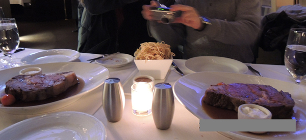 19時45分にホテルロビーに集合して、タクシーに乗ってフリーモントのプラザホテル内にある元ラスベガス市長オスカーグッドマンがオーナーのレストランオスカーに向かいました。ここはベガス在住Rさんが予約してくださっていた今回楽しみにしていた高級レストランです。店内に入るとさすがにゴージャスでとてもドキドキしました!!!オーナーであるオスカー・グッドマン(前ベガス市長)の写真や、芸能人やスポーツ選手、政治家などとのツーショット写真が沢山飾られたコーナーもあり、もちろん我らがセリーヌの姿もありました。 注文は、Mさんがセリーヌバンドのジョン・アーノルド氏におススメされていた一品「プライムリブステーキ」を4人で2皿、その他にパンに、アボガドサラダやポテトリングを注文。私はグラスで赤ワインも注文しました。これらできっと4人でぴったりの量だろうと計算していたのですが・・・・・・ジョンおススメのリブステーキがかなりジャンボで、分厚く、しかもミディアムで注文したのに、これではまるでレア状態で、まるでホラー映画のようにフレッシュな血がポタポタとしたたっているではありませんか!!!も〜も〜まさに大きなジョンにはぴったりだけど、日本人の私たちには食べきれません〜的なアメリカンサイズに私たちは大笑いしてしまいました。1枚をシェアした私とMさんは数口でギブアップ、GさんとM2さんは2人でなんとか1枚を完食。気を取り直してお口直しのデザートを注文。私はチョコレートのアイスクリームにフルーツが添えてあるプレートにしたのですが、とても美味しかったです。 私とM2さんは明日帰国の途に着くので、4人全員では今夜が最後の晩餐ということで、まだ旅行を続けるMさんとGさんにビデオメッセージをもらいました。私もM2さんも帰国したくない気持ちでいっぱい。別れが名残惜しいです・・・・。食事が終わり、ホテル前でタクシーに乗って、ティーアイホテルに戻りました。ホテルのエレベーター前で私とM2さんはMさんとGさんにお別れのご挨拶。「楽しい旅をありがとうございました、また日本で再会しましょうね!!!」
