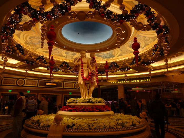 18時30頃にパリスホテルの中央エレベーターでGさんと待ち合わせ。Rさんへのお土産、頼まれた免税品、ジョンへのプレゼントを手に、シーザーズパレス のフォーラムショップス内にあるレストラン「スパゴ 」へ向かいました。夜のベガスを歩くと、やっぱり例年より寒い!!!!日本とさほど変わらない寒さだと感じました。今夜のシーザーズパレス外側の広告塔には、昔からのヘッドライナーの一人であるエンターテイナーのジェリー・セインフィールドのショーの看板が掲げてありました。コロシアム中央の看板も彼のものになっていました。そしてコロシアム付近では同じくヘッドライナーのエルトン・ジョンやロッド・スチュワートの大きな写真も飾ってありました。セリーヌショップは健在で安心しましたが、お食事の後でゆっくり寄ることにして、まずは外観だけ見てスル―しました。
