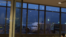 身軽になった後、送迎デッキで飛行機の離発着の様子をのんびり眺めた後、空港内のロイヤル で朝食タイム。滑走路の見える店内でサンドイッチセットとホットコーヒーをのんびりいただきました。11時半過ぎ頃手荷物検査場を通過して、私の搭乗する13時10分発成田行きANA2144便が出発する9番搭乗口へ向かいました。搭乗口ではゆっくり座って待ち、12時55分頃から搭乗が始まりました。搭乗時刻の前に、飛行機が満席で機内トランクルームに余裕がないので、、出来るだけ手荷物は預け荷物に回して下さい、ご協力いただける方は今から受付しますなどとのアナウンスがあっていて、やっぱり皆さん荷物がとっても多いのね〜と実感しました。