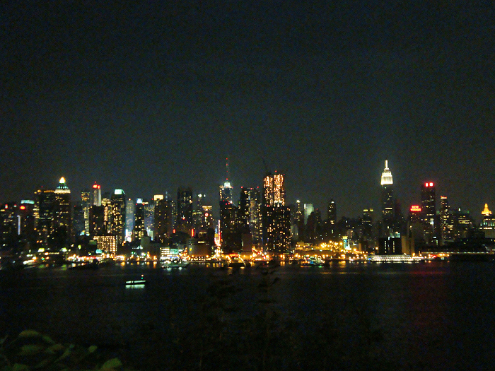 ◇二大夜景ツアー⇒四大夜景ツアーへ (オプショナルツアー) ペンシルバニアホテルに19時15分集合ということだったので、ガイドさんを待っていたんですが、時間を過ぎてもいらっしゃいません。不思議に思って、ツアー会社である"あっとニューヨーク"の事務所に電話しました。レンタルケータイは持っていましたが、公衆電話からだと通話料無料なので、公衆電話からかけることに。初めての海外の公衆電話、ちょっと勝手が分からずドキドキしたんですけど、なんとかかかり、事務所の方が出てくれました。「○○様、ご連絡しようとしてたんですが、連絡先がわからなかったんですよ、すいません!!!(確かにレンタルケータイの電話を知らせてなかったし、前日のあっとニューヨークさんへの確認電話も入れるの忘れていたのは私です・・・汗)今ガイドが交通渋滞に巻き込まれて到着が遅れていますので、もう少しそこで待っててくださいね!!」とのことでした。そして10分送れでガイドの小池さんが到着。中型ボックスカーで私達を含め6名を連れて夜景観光がスタートしました。到着が遅れたお詫びにオマケ観光をつけますからということで、ロウアーマンハッタンやブルックリンの治安面の怪しい部分を中心に(爆)車で説明しながら巡ってくれました。もちろん下車せず車窓観光ですが。これはとっても怪しすぎで普通の観光コースには入っていないものです。このガイドさん、ものすごくおもしろい方で、車中を終始大爆笑の渦に巻き込みながら、楽しい時間を過ごしました。車は一路ブルックリンブリッジを渡り、ブルックリン地区へ向かいます。ブルックリンは工場が多いんだそうです。また特にユダヤ教徒の方が多く、真っ黒のロングコートのような衣装に、頭には丸くて平べったいカッパの頭みたいな黒い帽子や黒いシルクハットをかぶっていて、もみあげのひげをアゴの先くらいまで伸ばしている人が多く居るのを見かけました。一見とっても異様ですが、これも人種のるつぼであるNYの一つの文化なんですね。まるで吉本の髭男爵の山田さんと樋口さんがうじゃうじゃいるって感じですね(笑)さて、まえおき観光は終わり、いよいよ夜景観光スタートです。二大夜景コースはブルックリン橋とダウンタウンの夜景とロックフェラーセンターのトップオブザロックからの夜景でしたが、イースト川の対岸プロムナードからの夜景観光にも連れて行ってくれました。このツアーは二大夜景と四大夜景コースの方々が混在してたせいかもですね。今日は休日ということで、平日よりは光量が若干少ないという話ですが、それでもキレイで、はっと息を呑む美しさです。ロックフェラーは昼間も登って夜も登ったので、2倍風景が楽しめて最高な気分でした。夜景写真はなかなか難しい!!!本物は記憶にとどめてつつも、一生懸命撮影しました。写真より実際はもっともっときれいだったのです!!!!ここで私達の申し込んだ2大夜景ツアーは終了予定でした。ですが、到着に遅れたので、これからお客さんを連れて行く4大夜景コースの残り1箇所も案内しますよ、しかもホテルまで送ってあげますとのことでした。ありがたい話に、二つ返事でOK。かなり得しちゃった感じで嬉しいです。そのおかげで、ハドソン川を渡ったニュージャージー州側のハミルトンパークからの夜景も鑑賞することが出来ました。大満足です。その後、ガイドの小池さんは、ホテルまで送ってくれて、時間はもう23時を回っていたでしょうか。疲れていたけど大満足。本当に楽しかったしラッキーなハプニングでした。ニューヨークの夜景、やっぱり一生に一度は見ておいたほうがいいです!!!大興奮のニューヨーク満喫の1日が終了したのでした。